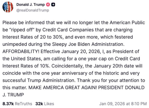 米ドナルド・トランプ大統領が1月9日(現地時間)に発表した、クレジットカードの金利(Interest Rate)を1年間限定で10%の上限に抑え込む(Capping)という大統領令を今年2026年1月20日付けで発効するという発言が大きな話題となっている。