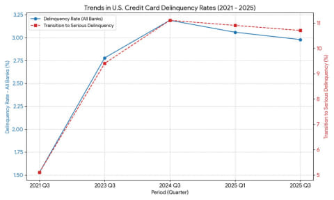 そのピークは2024年にやってくるが、現在は横ばいあるいは微減の傾向にある。理由としては、2024年にクレジットカードを発行する銀行側が審査基準を厳しくした結果、延滞率を抑え込む方向に作用したことが大きい。また別の視点では、インフレ懸念がやや和らいだこと、そしてトランプ政権の成立で金利引き下げへの期待が高まったことで、今後の金利負担が減るとの考えから(返済を優先するため)延滞率が抑え込まれているという意見もある。