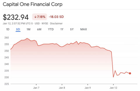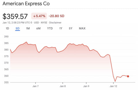 トランプ大統領の発表を受け、クレジットカードを発行するCapital OneやAmerican Expressなど、主に銀行関連の株価は1月11日月曜日の株式市場オープンを受けて大幅に下落している(米国では主に銀行がクレジットカードを発行している)。