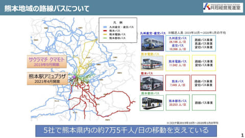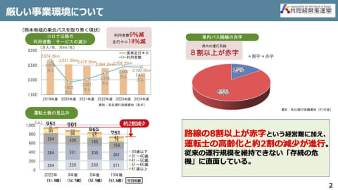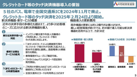 2024年に大きな議論を呼び起こした熊本地域の事例だ。市内を走るバスを中心とした公共交通はそのほとんどが赤字路線であり、同年度内にも迫っていた交通系ICカードを取り扱う機器の更新費用を賄えず、より安価な“タッチ乗車”を採用し、Suica等の交通系ICの利用を廃した。シンポジウムに登壇した共同経営推進室担当の森山諭氏によって提示されたスライド資料を3枚紹介する。