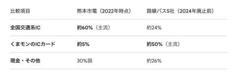 両者の違いはその利用層にある。2022年に熊本市電が“タッチ決済”に対応したとき、その時点での同市電の支払い方法の比率は全国共通の交通系ICカードが約6割、くまモンのICカードが5%、現金とその他の支払い手段(各種割引パスなど)が3割ほどという内訳だった。他方で、2024年に交通系ICカード廃止直前の路線バス5社の支払い手段内訳は、最大勢力のくまモンのICカードが5割超、全国共通の交通系ICカードが4分の1、残りが現金という割合だった。