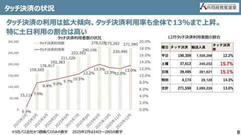 スライドには掲載されていないが、アンケート調査による同地域の路線バス満足度は2割程度で、地方都市にはありがちの事情で自家用車による移動比率が圧倒的に高い。結果として道路渋滞が慢性化し、バスの遅延も酷くなると悪循環に陥っている。ない袖は振れないということで、「タッチ決済」を選ばざるを得ず、利用者には認知して体験してもらうことが必要ということでさまざまな施策を打ってきたのがこれまでの流れだ。