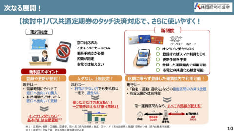 くまモンのICカードはFeliCaベースなので、運賃箱の読み取り機としては全国共通の交通系ICカードと共通だが、こちらは高額な更新費用はかからない。一方で、くまモンのICカードは発行や更新作業に窓口対応が必要なほか、熊本市電での取り扱い終了により利用範囲が限定されることになった。そこで、現在くまモンのICカードで提供されているサービスを徐々に“タッチ乗車”へと載せていき、前述の各種定期相当サービスを組み合わせた形で同等に利用できる環境を整えていく計画だ。
