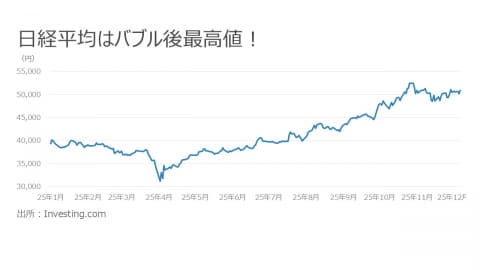 日経平均株価は、直近1年間で大きく上昇し、バブル崩壊後の最高値を更新しました。2025年4月には、いわゆるトランプ関税ショックによって一時的に下落する場面もありましたが、その後は持ち直し、全体としては上昇基調が続いています。現在は5万円台をつけており、「さすがに高すぎるのではないか」と感じる方も多い状況です