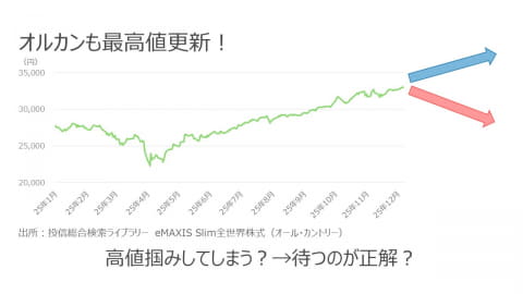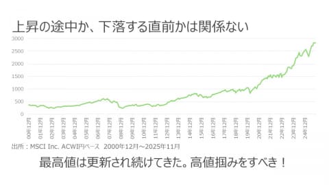 結論から言うと、「高値掴みを恐れすぎず、積立投資を続けていく」が重要になります。一見すると逆説的な考え方ですが、長期投資という視点で見ると、実はとても合理的な判断です。