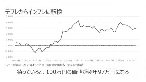 現在は、日本でもおおむね3%程度のインフレが続いています。この3%のインフレは、100万円を現金で持っていると、1年後には実質的に97万円の価値になってしまうことを意味します。つまり、投資をせずに「待つ」という選択そのものが、コストになっているのが今の環境です。