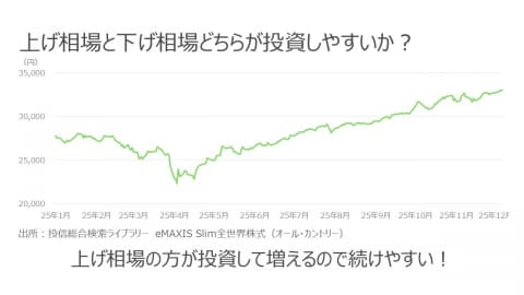 一方、上げ相場では、買った後に比較的早く含み益になりやすく、資産が増えている実感を持ちやすくなります。そのため、投資を継続しやすいという面があります。一般的には、下げ相場よりも上げ相場の方が、精神的には投資を続けやすいと言えるでしょう。