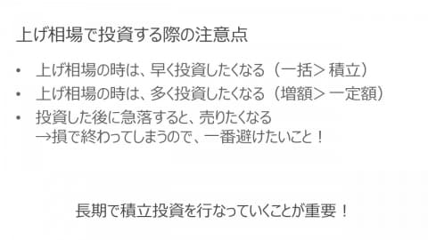ただし、上げ相場にも注意点があります。相場が順調に上がっていると、早く多く投資したくなり、積立投資では物足りなく感じて一括投資に踏み切りたくなることがあります。また、毎月の積立額を増やしたくなる気持ちも生まれがちです。しかし、その直後に急落が起きると、恐怖から売却してしまい、損失を確定させてしまう可能性があります。こうした事態を避けるためにも、上げ相場であっても無理に投資ペースを速めず、長期の積立投資を淡々と続けることが大切です。