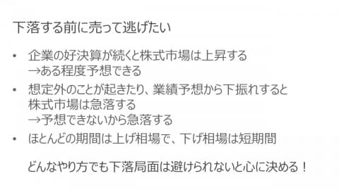 「下落する前に売って逃げたい」と考える気持ちもよく分かります。企業の業績が好調で、予想通りの決算が続くと、株式市場は緩やかに上昇します。一方で、戦争や災害、想定外の政策変更など、予測できない出来事が起きたときに、市場は急落します。急落が起きるのは、予想できないからこそです。