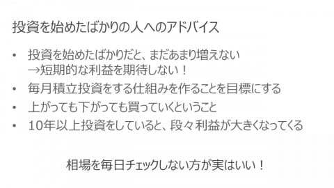投資を始めたばかりの人へのアドバイスもしておきます。始めたばかりの頃は投資額が小さいため、短期間で大きく増えることはあまり期待できません。そのため、短期的な値動きを気にしすぎないことが大切です。まずは、毎月積立投資をする仕組みを作ることを目標にしましょう。