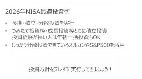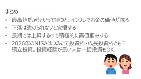過去を振り返ると、株式市場は長期では成長してきました。高値掴みを恐れすぎず、市場に居続けることが、結果的に資産形成につながります。2026年のNISAでは、つみたて投資枠と成長投資枠を活用し、基本は積立投資を続けること。投資経験がある方は、一括投資も含めて、自分に合った方法を選びながら、長期の視点で取り組んでいきましょう。