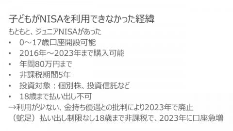 まず1つ目、NISAを子どもが利用可能になる点についてです。子どもがNISAを利用できなかった背景には、もともとジュニアNISAという制度があったからです。ジュニアNISAは0歳から17歳まで口座開設が可能で、2016年から23年まで金融商品の購入ができ、年間80万円まで投資できました。