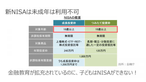 現在の新NISAでは、成長投資枠とつみたて投資枠の2つがあります。ただし対象年齢は18歳以上となっており、未成年は利用できません。一方で日本では金融教育が拡充されています。小学校、中学校、高校と金融教育が広がり、高校では資産形成についても学ぶようになっています。しかし投資に興味を持っても、子どもはNISAを使えないという状況になっていました。