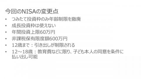 今回のテーマは「進化するNISA 『こどもNISA』など来年以降に拡充されること」です。「NISAを子どもが利用可能に」、「NISAの投資対象商品が拡充」、「NISAでの商品の入れ替えは見送り」の流れで説明します。