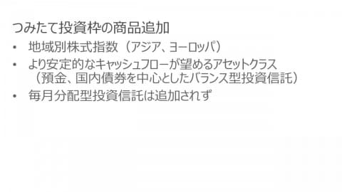 次につみたて投資枠の投資対象商品が増え、自由度が高まる可能性があります。地域別株式指数に連動した商品や、債券や預金中心のバランス型投資信託が加わることになります。