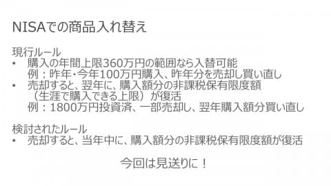 NISAで商品の入れ替えをやりやすくするという議論もありましたが、見送りとなりました。どういった変更が議論され、なぜ見送りとなったのでしょうか。