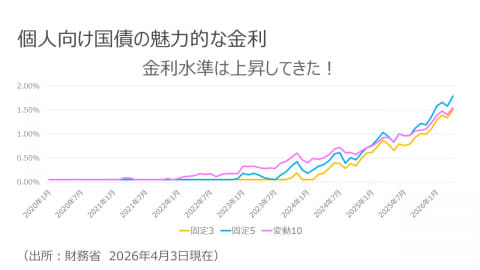 個人向け国債の最大の魅力は、定期預金よりも高い利回りです。2026年4月現在、各商品の金利は以下の水準となっています。