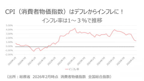 2020年のコロナ禍ではCPI(消費者物価指数)が一時マイナスのデフレ局面となりましたが、その後は一転してインフレが続いています。足元では1~3%程度のインフレ率で推移しており、世界情勢の不安定化も物価上昇の一因となっています。