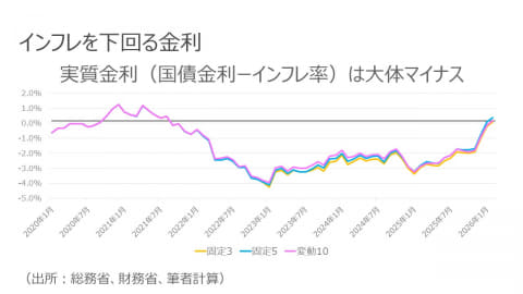 ここで問題になるのが実質金利(国債金利-インフレ率)です。金利が上昇してきたとはいえ、インフレ率が高い水準にある現在、実質金利はおおむねマイナス圏で推移しています。つまり、個人向け国債だけで資産を保有していると、物価上昇分だけ実質的な資産価値が目減りしてしまうということです。