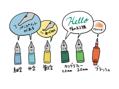 ペン先の種類も豊富です。細字、中字のほかに、カリグラフィー(1.0mm幅、2.0mm幅)、筆文字、ブラッシュがラインアップされており、イラストやアート作品の制作にもぴったりです。なお、ペンポイントがついているのは細字、中字のみです。