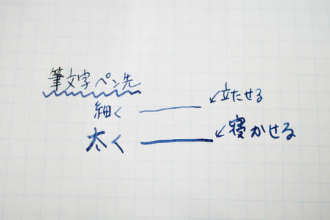 私が特に気に入っているのは、筆文字のペン先です。先端がくねっとした独特の形状になっており、紙に当てる角度によって線幅が変わるので、立てて細くすれば日記など普段の筆記に、寝かせて太くすれば宛名書きなどにと、ひとつで幅広いシーンに活躍します。太くするとインクの濃淡も出やすくなりますので、その色の変化を眺めるのも楽しみのひとつです。