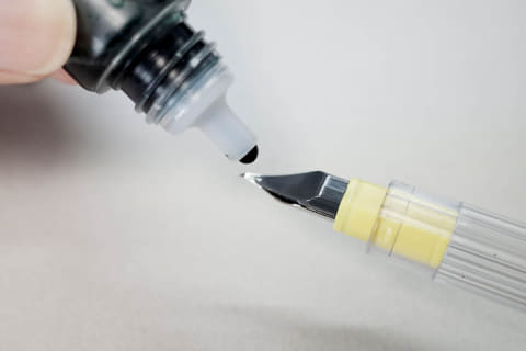 進化系といっても、使い方は従来のつけペンと変わりません。ペン先をハート穴が隠れる程度までボトルインクに直接ひたし、余分なインクがあればボトルのフチで落とします。あとは普通に書くだけ。インクが足りなくなれば、都度ボトルにひたして補充します。使い終わったら水でインクを洗い流し、ティッシュや柔らかい布で水分を拭き取ればお手入れ完了です。