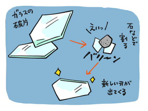 岡田さんは、路上の靴職人が靴底を削る刃物としてガラスの破片を使っていることを知っていました。切れ味が悪くなったら石でガラスを割り、新しい刃を作っていたのです。刃が鈍くなったら、新しい刃が出てくるようにすればいい。しかし、金属の刃はガラスほど簡単には割れません。