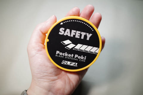 各種ある刃折器の中でも、一般のご家庭にぴったりなのが「ポケットポキ」(オープン価格/市場価格:200円前後)です。大きさは手のひらに乗るくらいで、平たい円筒形をしています。