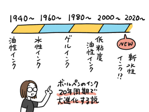 こうしてみると、1940年代に油性インク、1960年代に水性インク、1980年代にゲルインク、2000年代に低粘度油性インクと、ボールペンのインクは約20年に一度、大きな進化が起こっているのが分かります。