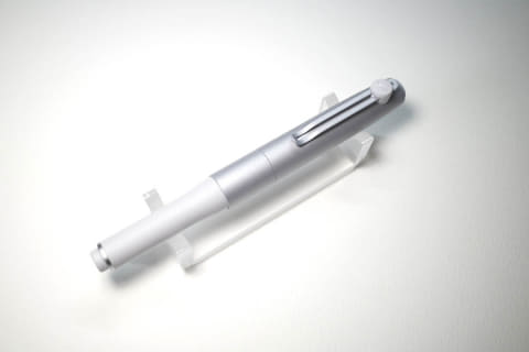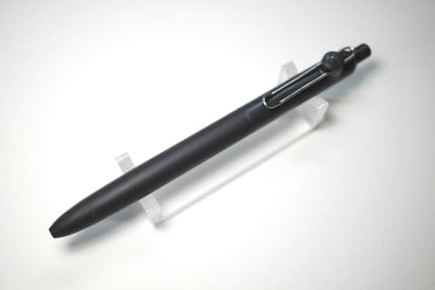 「フローモデル」は中価格帯(1,320円)で、価格に見合った高級感のある佇まいです。特徴は何といっても、アルマイト塗装が施されたアルミ製のグリップ。このグリップがややかたく、ともすれば滑りやすいため、ラバーグリップが好きな方は合わないと感じるかもしれません(私も正直に言えばちょっと苦手です)。裏を返せば、滑りのおかげで手帳のペンホルダーなどにセットするペンとしては最高です。また素材のツートン感がおしゃれな雰囲気で、見た目の良さも抜群。アクセサリー感覚で使いたくなるペンです。