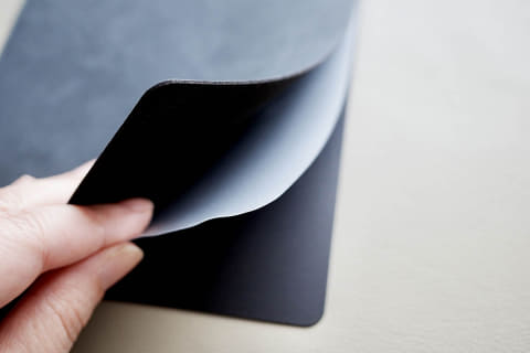 ちょっと良いホテルのフロントで宿泊カードなどを記入する時、「あれ? 妙に書きやすいな?」と感じたことはありませんか。それ、実はカウンターに敷いてあるデスクマットのおかげです。適度な弾力による筆記時の沈み込みによってペン先が紙に食いつきやすくなり、滑りが抑制されるのでグッと書きやすくなるのです。