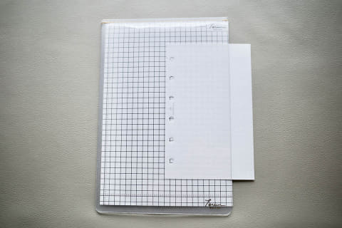 裏技的な使い方としては、ポケット部分にシステム手帳のリフィルだけを数枚入れて、下じきだけを持ち運ぶ、なんてこともできます。散歩に出るのに荷物はなるべく軽くしたいけど、立ち寄ったカフェでちょっとだけ書き物をしたい、なんて時によさそうです。