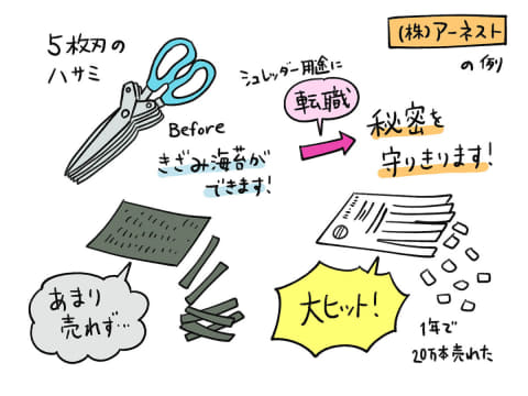 フィルム加工の技術を活かして化粧品業界で成功した富士フイルム、作業着の機能性とコスパの良さを活かしてスポーツ・アウトドアウェアのブランドとしてもブレイクしたワークマンなどは有名です。文具業界では、もともと刻み海苔を作るハサミとして鳴かず飛ばずだったものが、シュレッダー用途を前面に打ち出すことで大ヒットした、なんて例もありました。