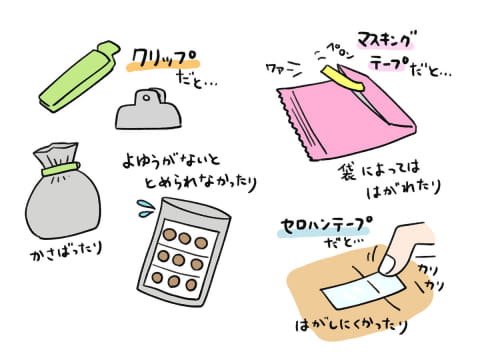 また他のテープとの比較では、マスキングテープより接着力が強いので、厚みやハリのある袋でもしっかりとめられる安心感があり、開ける時にはセロテープより剥がしやすいのも気に入っています。いちど剥がした後にまた貼ることもできるので、ちょこちょこ使う食材でも都度テープを新しく貼り直す必要がなく経済的ですよね。