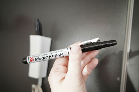 本筋からはちょっと外れますが、一緒に使うなら片手でサッと書けるノック式の油性ペンがおすすめ。私はマグネット付きのペンホルダーを冷蔵庫の横にセットして、その中に入れています。