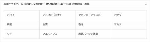 さらに、一部の国では「早割キャンペーン」として、24時間490円と半額になる。なお、早割・早割キャンペーンが適用されるのは8日(192時間)までなので、それ以降は24時間980円となる。