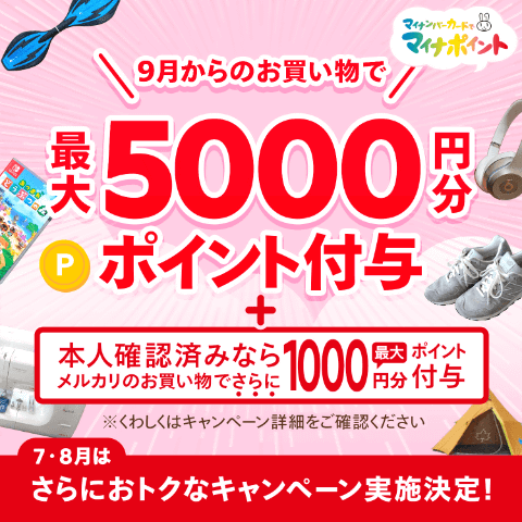 先行登録で1,000ポイント+メルカリの買い物5%還元で合計上限2,000ポイント。8月31日までの申込みで、「総額1億ポイント山分けキャンペーン」を実施。抽選で合計約13万名に最大1,000万円(総額1億円)相当のポイントを付与する