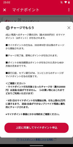 続いて本題の「d払い」ですが、こちらは「買い物のたび」にポイントが付与されるか、一定金額をあらかじめ「チャージ」するかという2つの選択肢があります。ポイント還元を最大限まで狙うためにはどちらも20,000円まで使うという前提で考えた場合、20,000円に到達したことがわかりやすいチャージのほうが使いやすいだろう、という理由で今回はチャージを選択しました。