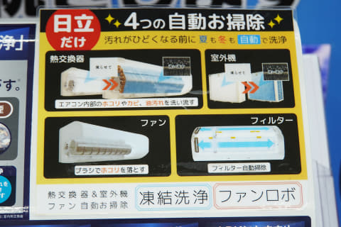 「とにかくエアコンの掃除が面倒、という方が多いので、自動的に『きれい』を保てる機能はどのメーカーもかなり進化しています。フィルターの自動掃除機能は以前からありましたが、最近は熱交換器と呼ばれる機械内部まで自動洗浄してくれる商品が登場。日立・白くまくんの上位機種に搭載されている『凍結洗浄』は内部に霜を大量付着させ、それを一気に溶かし大量の水で洗い流す機能です」