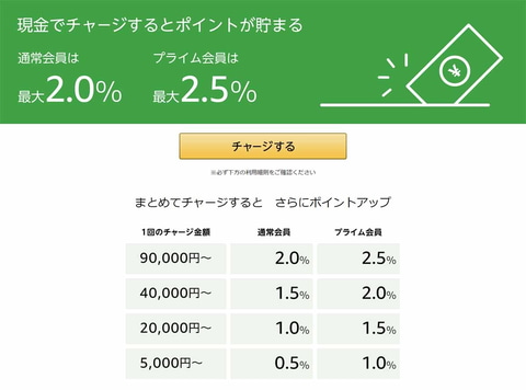 2万円以上のチャージで、プライム会員は1.5%(通常会員は1.0%)、9万円以上のチャージではプライム会員が2.5%(通常会員2.0%)が付与されます。大きな買い物がある場合などは、Amazonチャージを活用するのもよさそうです。