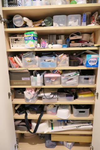こうしたものはどんどん棚の下部に入れていきます。また、我が家の収納棚は奥行きがあり、普段使っている収納ボックスだと奥が余ってしまうので、ついつい奥にも物を詰めてしまっていました。