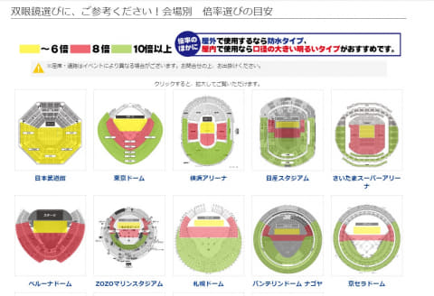 同じ会場でも、席によって推奨の倍率が異なります。東京ドームの場合はステージから近い席なら~6倍、中間くらいなら6~8倍、バルコニーや2階席なら8~10倍以上を推奨。「会場や席によっても変わりますが、よほど狭い会場でない限り8倍を基準に選ぶのがオススメです」(乙川さん)