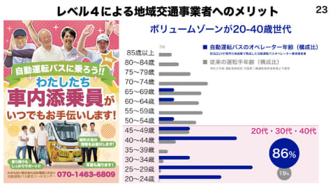 レベル4のメリットの一つに、人材募集がある。現在自動運転バスを運行している地域で運転手の役割を担っているオペレーターは、バス会社で通常集まる平均年齢層に比べると若い。8割が40代以下で、女性比率も4倍。つまり「バス会社が若い人や女性が集めやすいのが自動運転」というわけだ。「これまで地域の交通に興味を持ってなかった層が公共交通に興味を持ってくれる」ようになる効果もあるという。