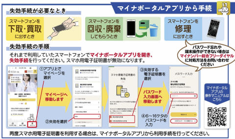 機種変更などで、下取・買取に出す場合は、スマホ用電子証明書の「失効」手続きを必ず行ないます。この場合、使っていたスマホでマイナポータルアプリを開き、失効手続きを行なうことで、スマホ用電子証明書が無効になります。修理に出す場合なども、この手続が推奨されています。