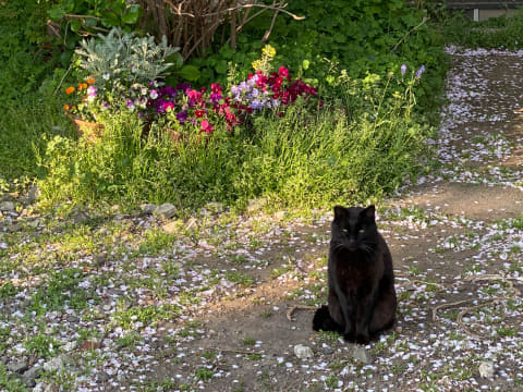 桜を見上げていたら下の方から「ニャア」とネコの声が。舞い散った花びらの前にはクロネコがいました。撮影させてもらったあとはしばらく一緒に花見を楽しみました。