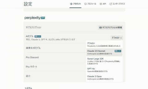 有償のProプランなら、検索と回答に用いるAIモデルを複数から選択できます。無料プランも含め、デフォルトで選択されているのはPerplexity独自の「検索に最適化されたモデル」ですが、Proプランに登録すると、コンテキスト長の大きい「Sonar Large 32K」や、最近リリースされたばかりの「Claude 3.5 Sonnet」、さらには「Claude 3 Opus」と「GPT-4o」も選べます。