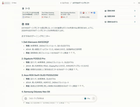 通常のWeb検索だとニュースサイトや個人ブログ、製品比較サイトにメーカーサイトなど、あらゆるソースがずらずらと一覧されてしまいます。どれを優先的にチェックすべきか迷ってしまい、購入に至るまで無駄に時間がかかってしまうかもしれませんが、Perplexityなら素早く決断できそうです。
