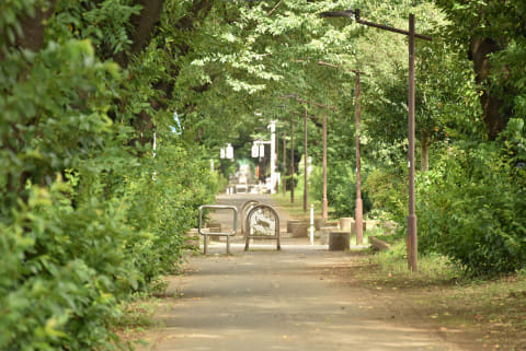 多摩都市モノレールの特徴は多々ありますが、立川駅北側には記事の冒頭にある写真の通り、モノレール下にサンサンロードと命名された約550メートルの自転車・歩行者専用道路が整備されています。サンサンロードには緑が溢れ、座って休憩できるベンチも多く設置されています。