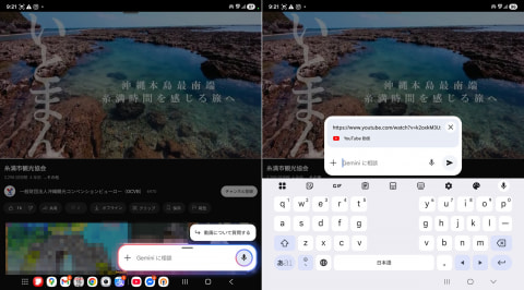 実際にYouTubeで旅行先の動画を見つけたら、再生しながらGalaxy Z Fold7の電源ボタンを長押ししてGeminiを起動。すると画面右下に「動画について質問する」と表示されるのでタップする。続けて開いたウィンドウにはYouTube動画のURLが表示され、その下にテキストウィンドウがあるので音声または文字入力で「動画の要点をまとめて、Keepに保存して」と指示する。