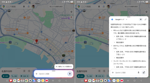 一般的にお店を検索する場合は、Google Mapに直接「沖縄料理店」などと入力するだろう。Geminiなら「この付近の沖縄料理店を教えて」と音声または文字入力すればよい。さらにそれだけではなく「お勧めのお店を教えて」とか「1000円以下で食べられるお店を教えて」という指示もできる。
